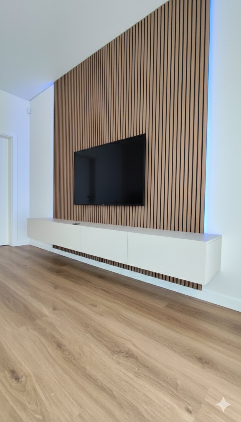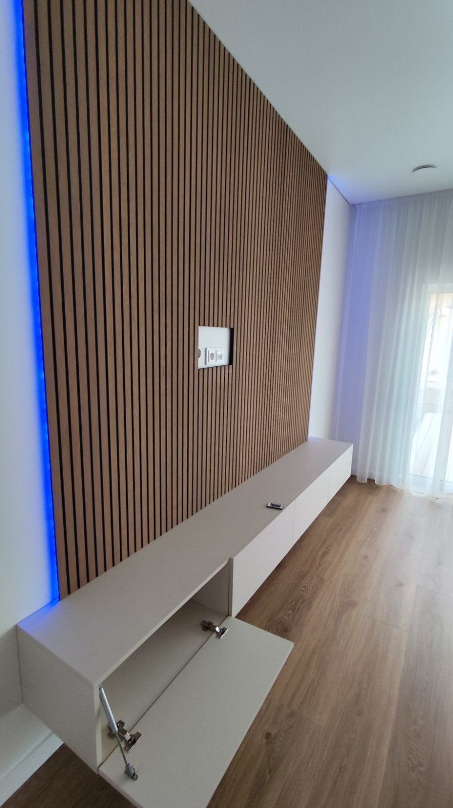 Pakabinama kašmyro TV konsolė – minimalistinis, tačiau labai funkcionalus sprendimas moderniai svetainei. „Plūduriuojantis“ montavimas vizualiai palengvina erdvę, o ilga, 2800 mm kompozicija sukuria tvarkingą ir vientisą TV zoną.