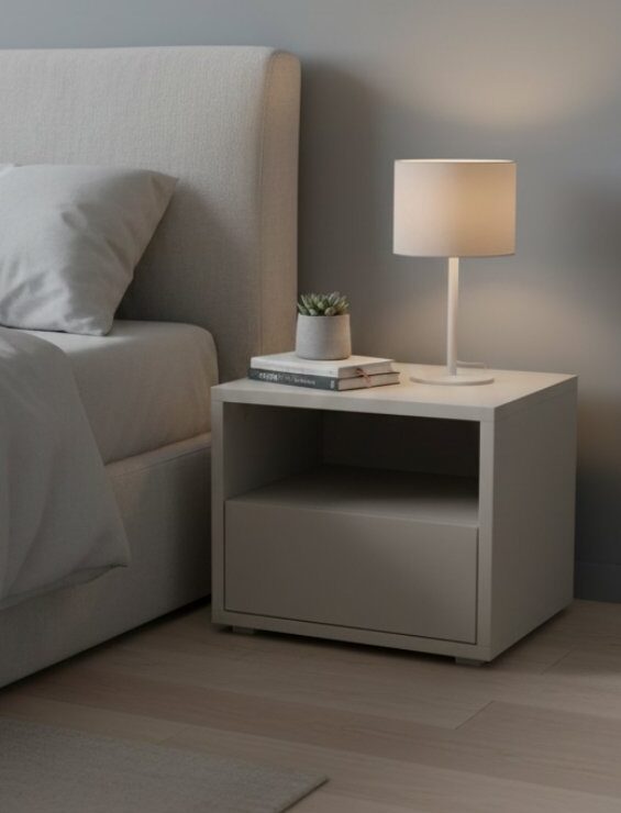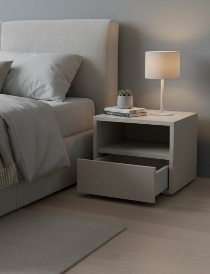Moderni ir subtili naktinė spintelė, sukurta patogiai kasdienai: viršuje – atvira niša smulkmenoms ar knygai, apačioje – talpus stalčius tvarkingam daiktų laikymui. Švelnus kašmyro atspalvis suteikia interjerui lengvumo ir jaukumo, o be rankenėlių esantis fasadas išlaiko švarias, minimalistines linijas.